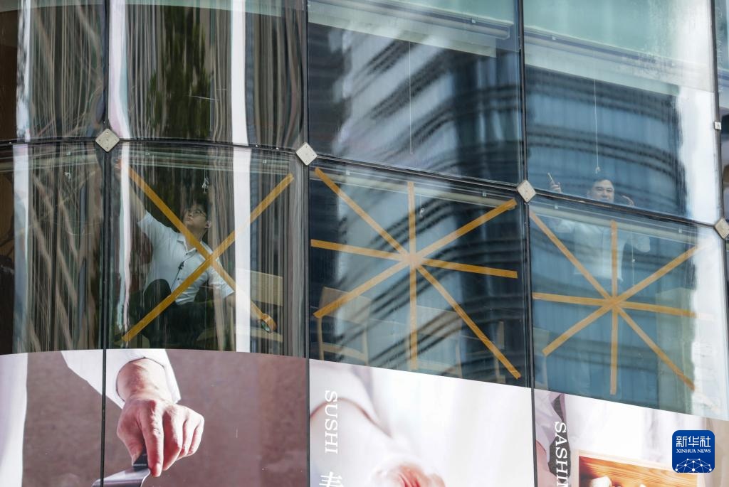 9月23日,在深圳市福田区一处商场,工作人员为窗户贴上胶带防范台风。
