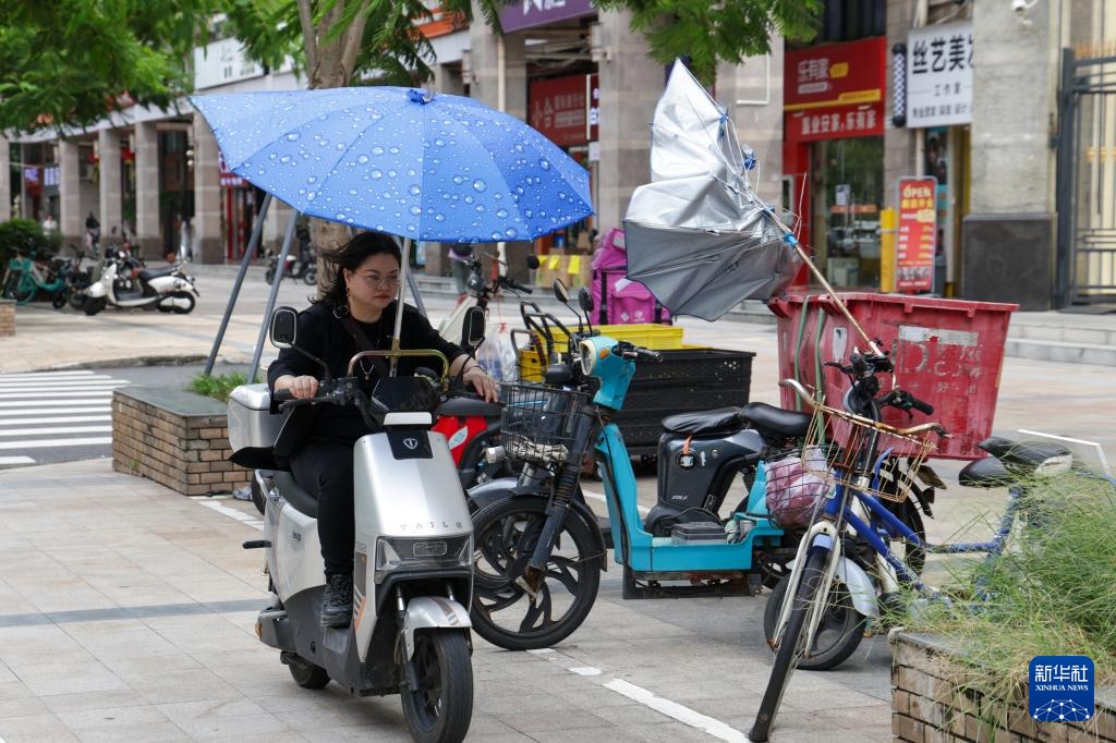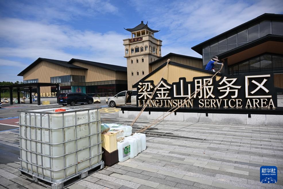 9月23日,在广东江门市的沈海高速梁金山服务区,工作人员在加固设施。