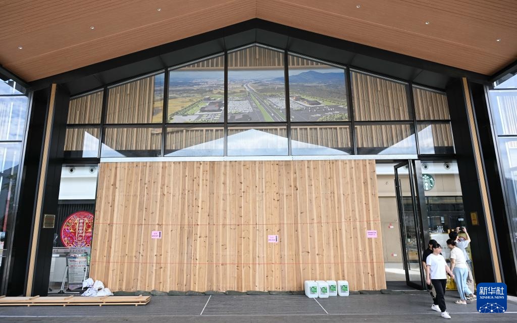 9月23日,在广东江门市的沈海高速梁金山服务区,落地玻璃大门外已经安装了防风木板。