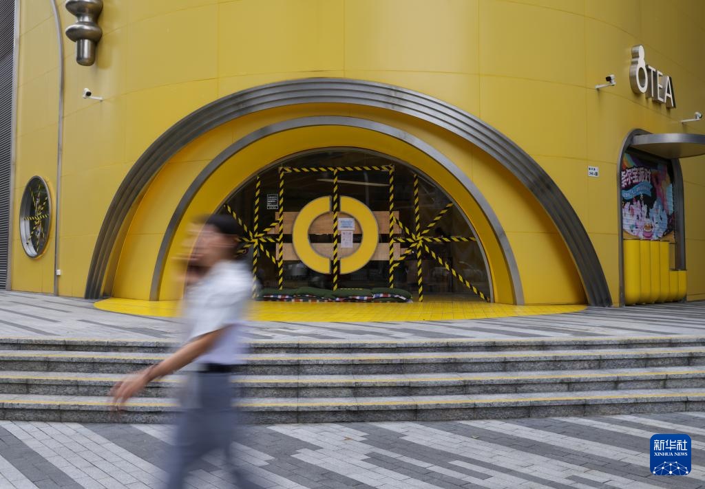 9月23日,在深圳市福田区一处商场,临街的玻璃门窗贴上了胶带防范台风。