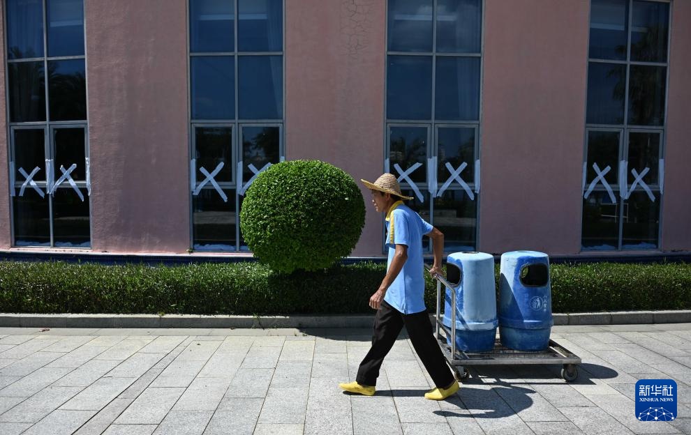 9月23日,在广东阳江市海陵岛一酒店,工作人员提前转移海边的垃圾桶。