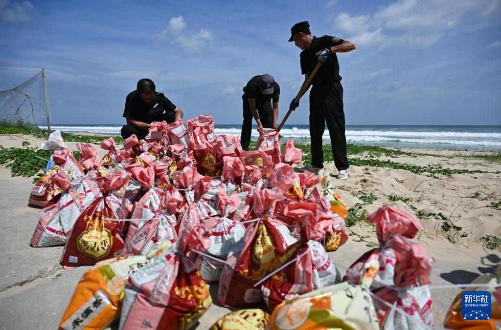 9月23日,在广东阳江市海陵岛十里银滩,酒店工作人员在填装沙袋。