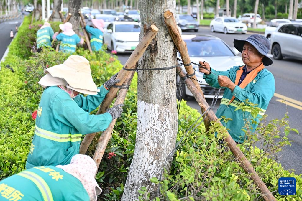 9月23日,海口市公共绿化管理所的工作人员在加固树木。