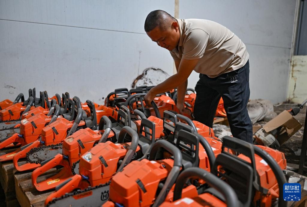 9月23日,海口市公共绿化管理所的工作人员在保养手提锯。
