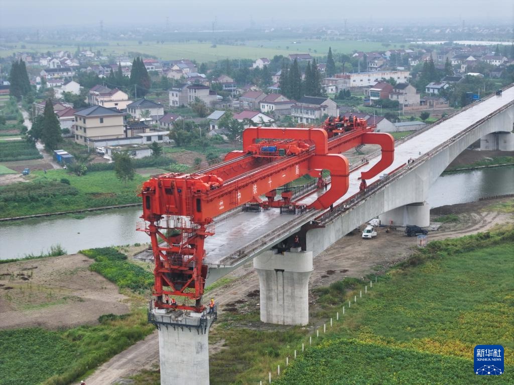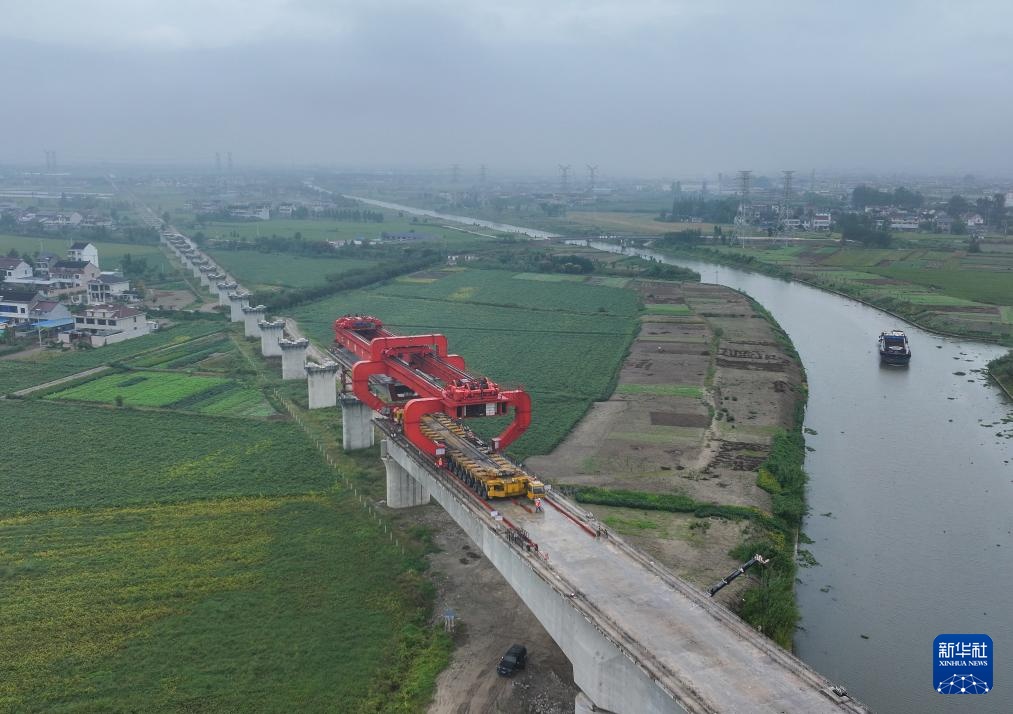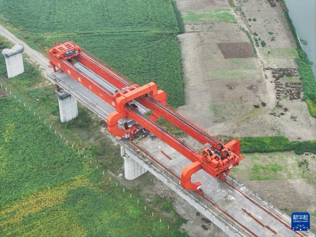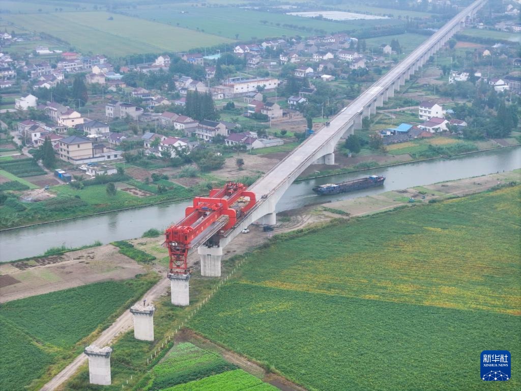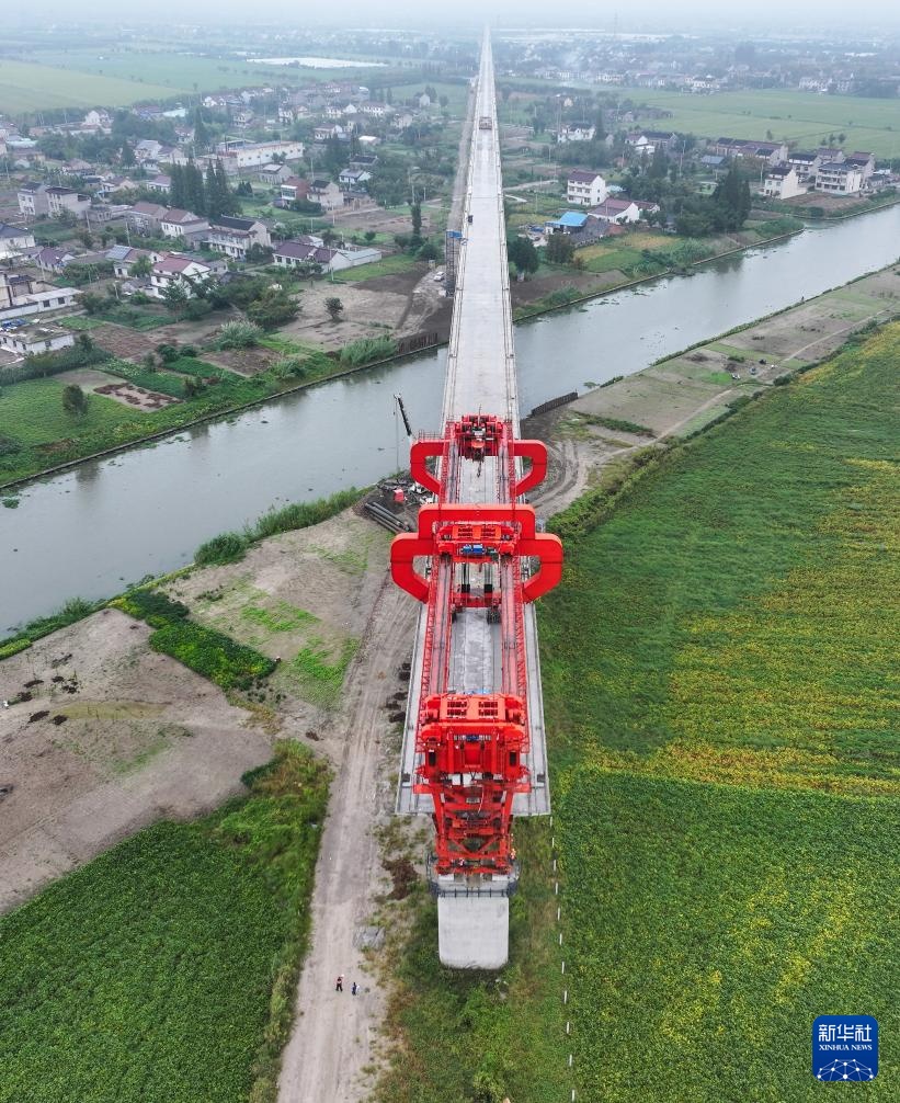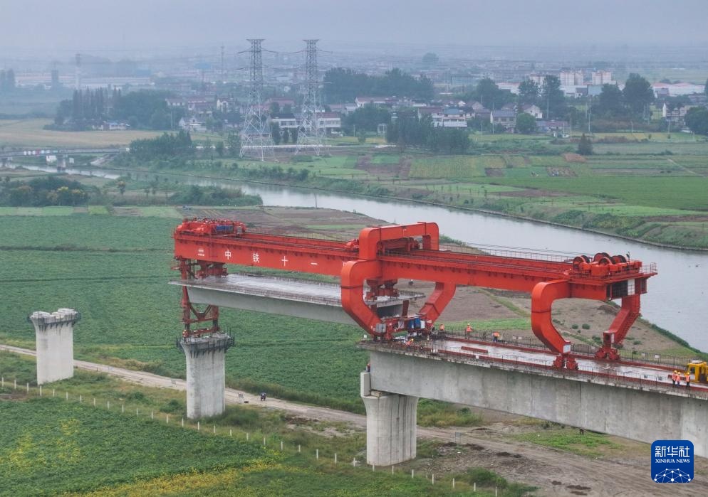 中铁十一局新建沪宁合高铁沪宁段通泰扬特大桥箱梁架设现场(9月24日摄,无人机照片)。