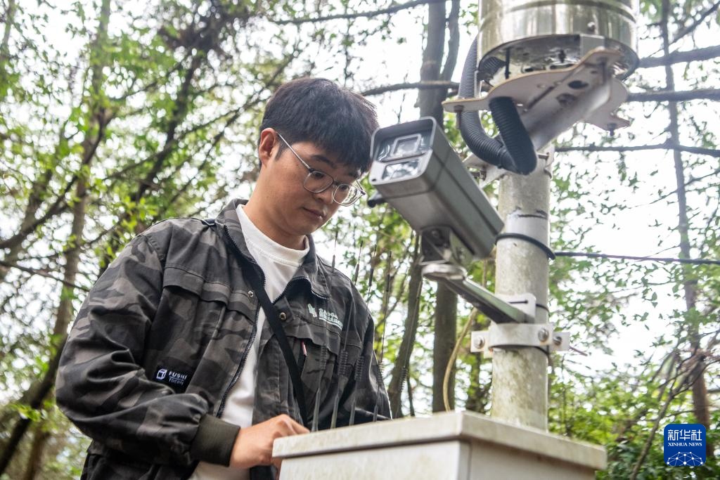 9月22日,在银杉群落监测样地,工作人员李新在检查调试监测系统。