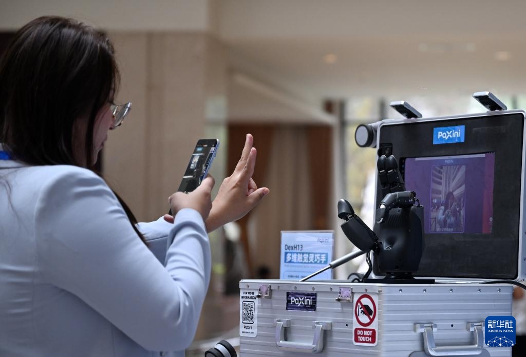 9月24日,与会嘉宾在2025中国民营企业投融资洽谈会开幕式会场外参观一款“灵巧手”。