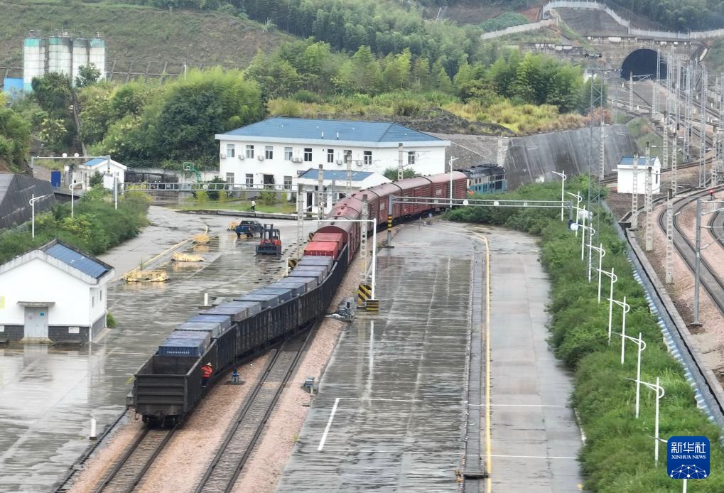 9月24日,货运列车开进衢宁铁路宁德营业部政和营业室装运周边县市运往世界各地的货品(无人机照片)。