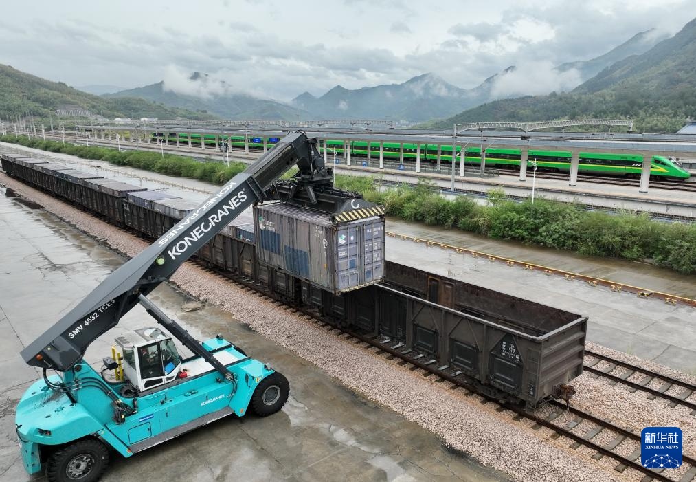 9月24日,衢宁铁路宁德营业部政和营业室工作人员在进行集装箱装卸作业(无人机照片)。
