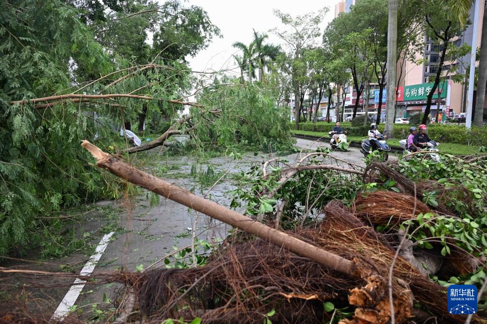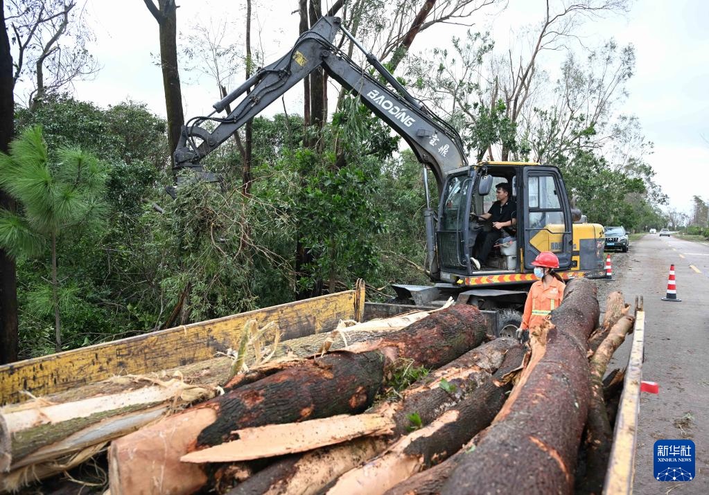 9月25日,在广东阳江市阳东区的228国道,公路局工作人员在清理倒伏树木。