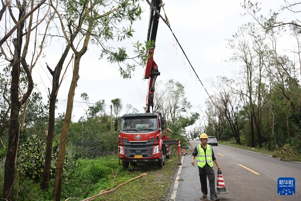9月25日,在广东阳江市阳东区的228国道,电信工作人员在抢修线路。