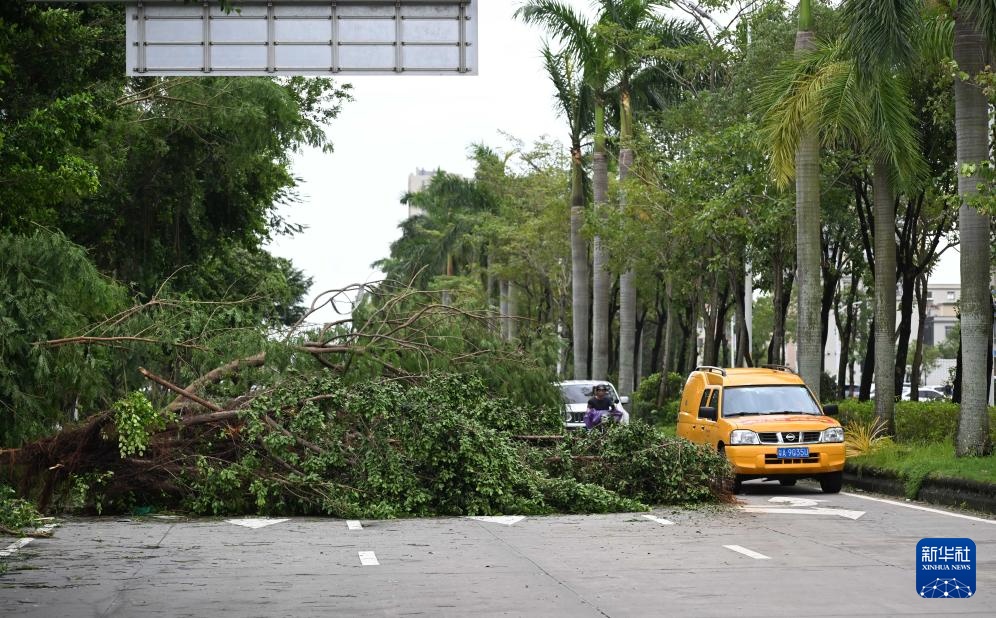 9月25日,在广东阳江市江城区东门南路,抢修车辆经过倒伏的树木。