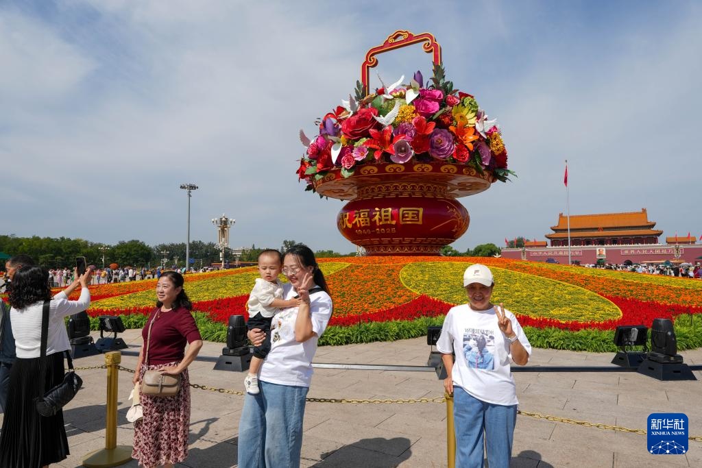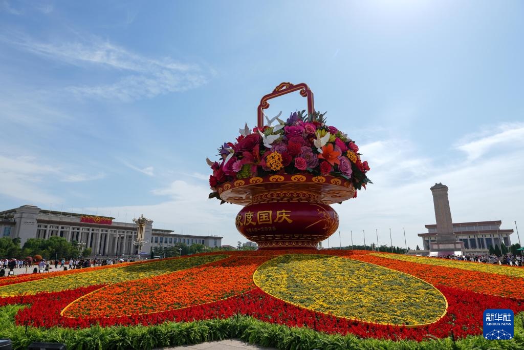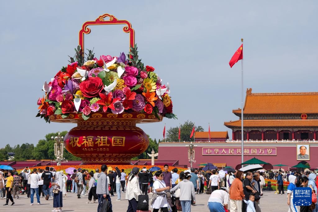 9月25日,2025年“祝福祖国”巨型花篮正式完工,亮相天安门广场与市民共度佳节。今年“祝福祖国”花坛以喜庆的花篮为主景,花坛顶高18米,篮体高16米,篮盘直径12米。篮体南侧书写“祝福祖国”“1949-2025”字样,篮体北侧书写“欢度国庆”“1949-2025”字样。篮内选取了美好寓意的花卉,其中荷花寓意“和和美美”、橄榄枝寓意“荣耀和平”等,还结合和平鸽元素,体现“和平发展、欣欣向荣”。