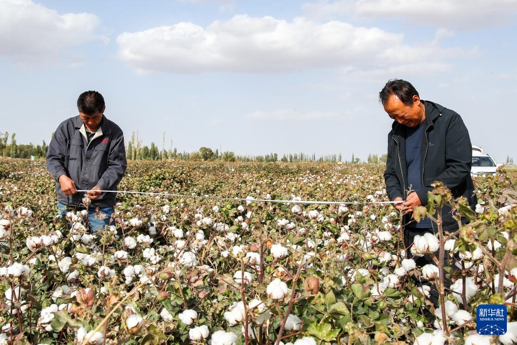 9月25日,在敦煌市转渠口镇阶州村盐碱地综合治理示范区的一片棉田,敦煌市农技中心高级农艺师贺生兵(左)和同事对棉花进行测产。