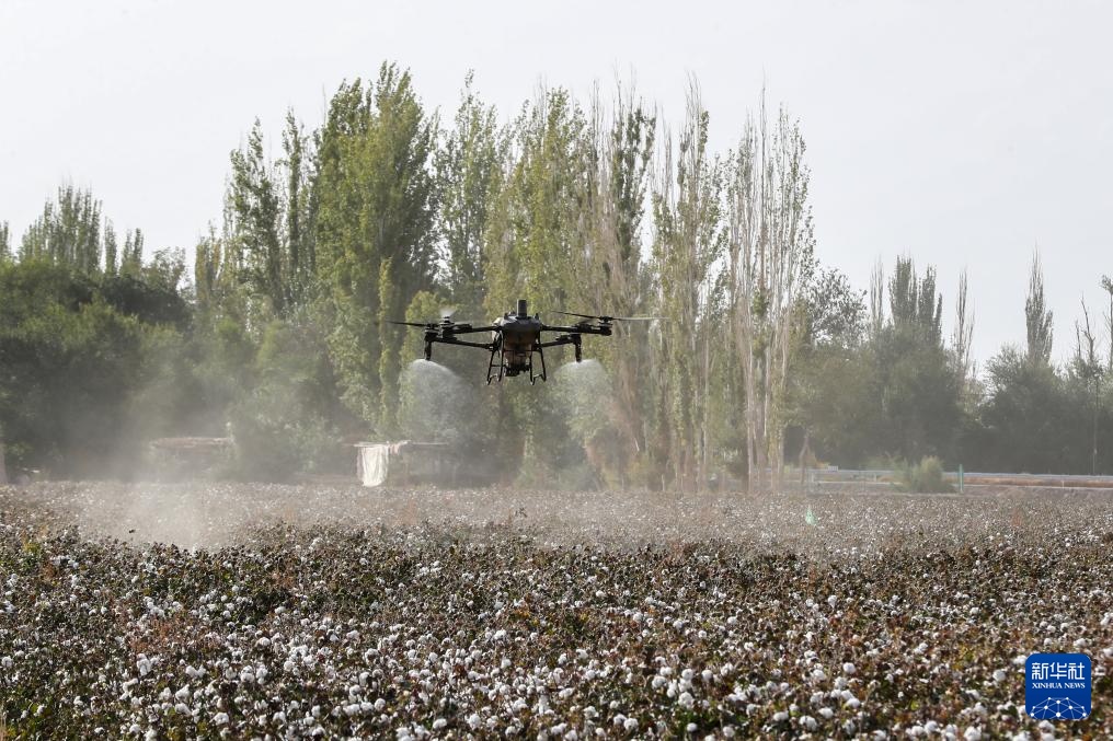 9月25日,在敦煌市转渠口镇阶州村盐碱地综合治理示范区的一片棉田里,农用植保无人机在进行喷施作业。