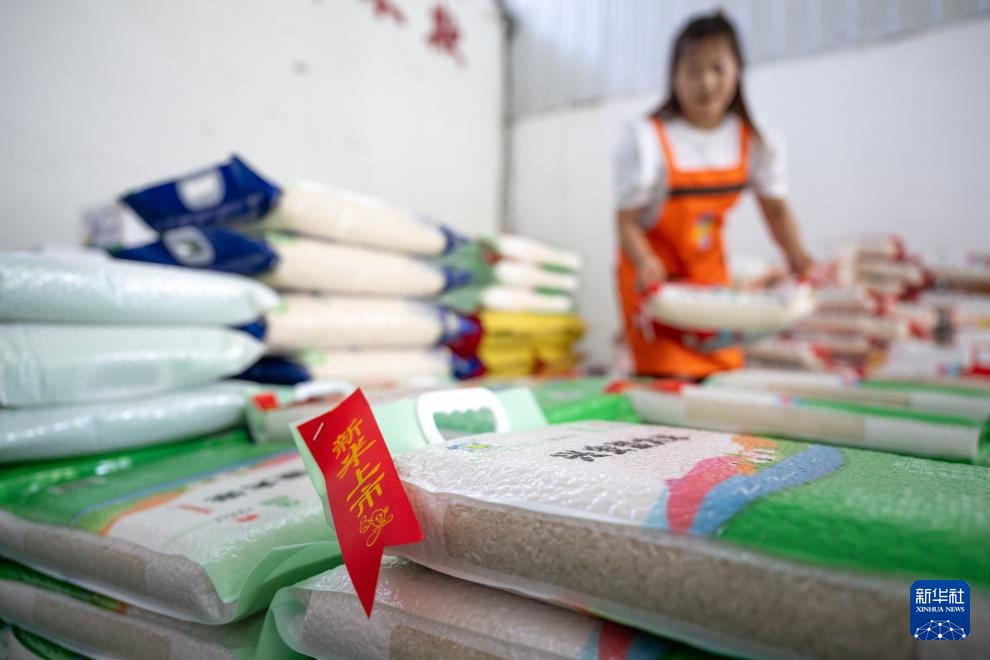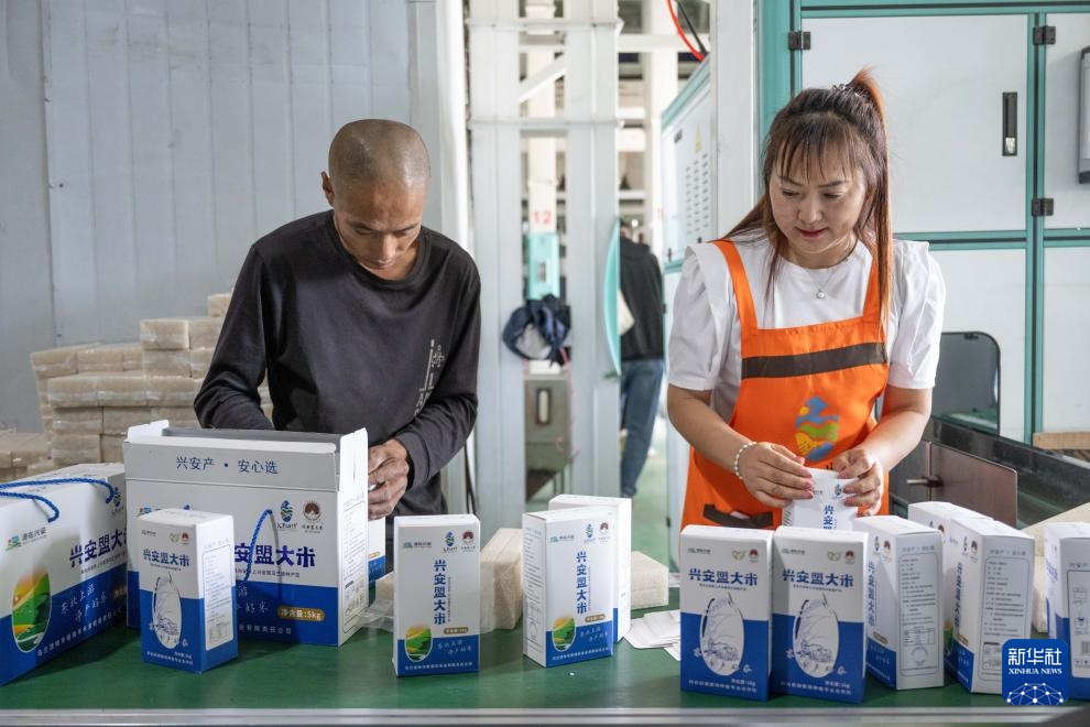9月26日,社员在内蒙古兴安盟乌兰浩特市义勒力特镇明武水稻种植专业合作社打包新米。