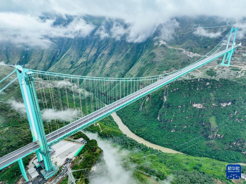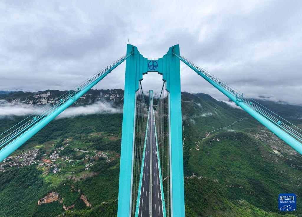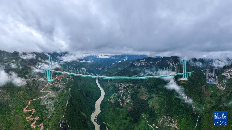 9月26日,雨后的贵州花江大峡谷云雾笼罩,花江峡谷大桥如同“钢铁巨龙”腾跃峡谷之上。花江峡谷大桥是贵州六枝至安龙高速公路的控制性工程,大桥全长2890米,主跨径1420米,是目前世界山区峡谷第一大跨度钢桁梁悬索桥;其桥面距水面垂直高度625米,是新的世界第一高桥。经过三年多建设,贵州花江峡谷大桥将于9月28日正式建成通车。