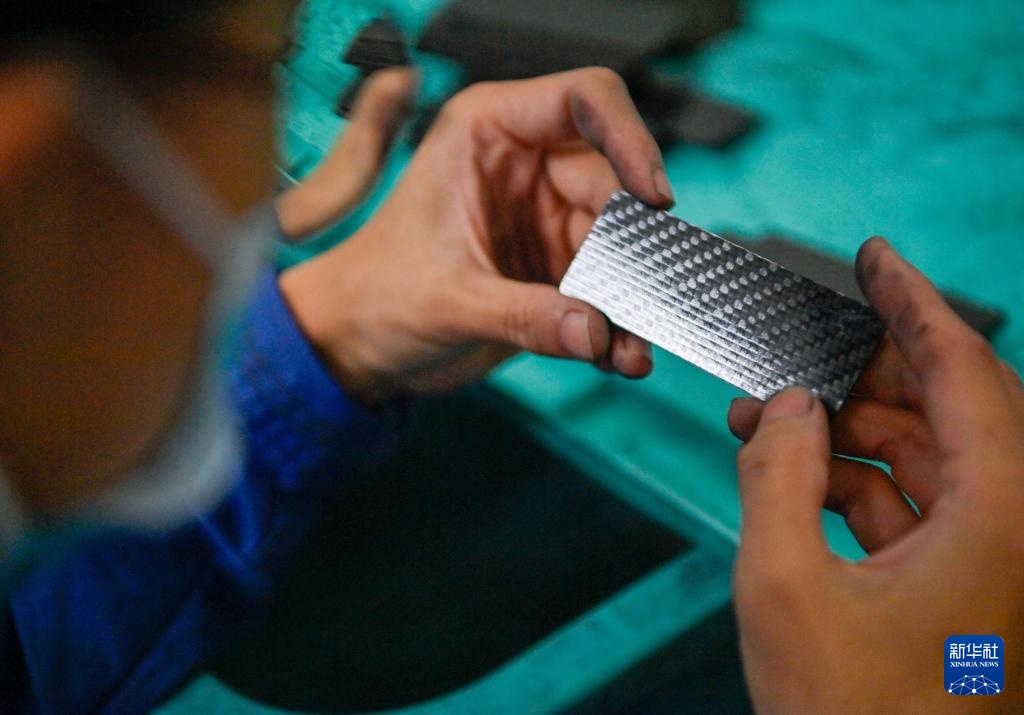工作人员在吉林化纤集团国兴复材有限公司车间检查雕刻后的碳纤维复材制件(9月17日摄)。