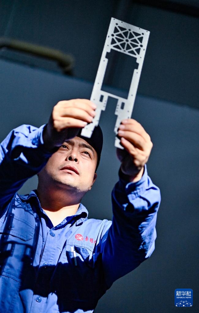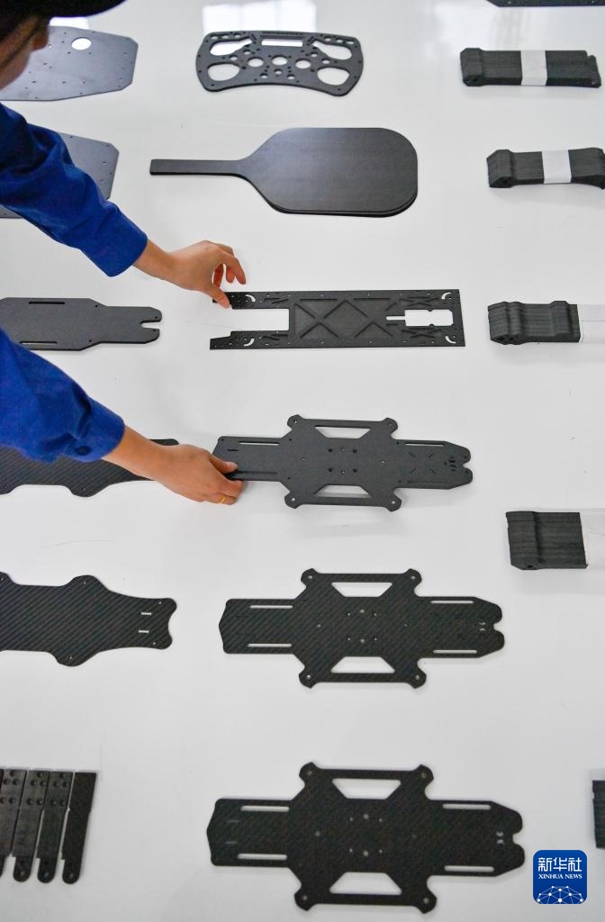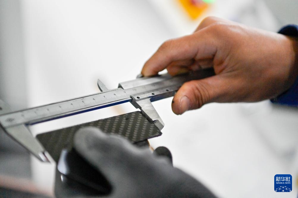 鲍雨彤在检查加工完成的碳纤维复材制件(9月17日摄)。