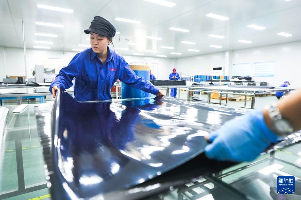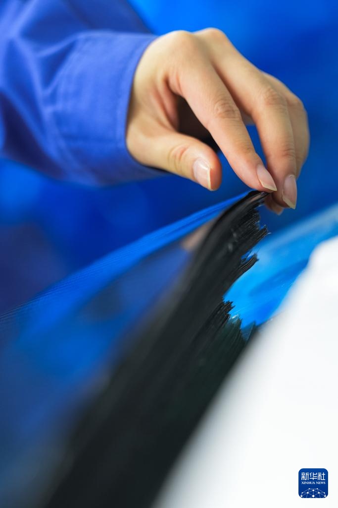鲍雨彤在吉林化纤集团国兴复材有限公司车间内进行碳纤维层压板铺贴工作(9月17日摄)。