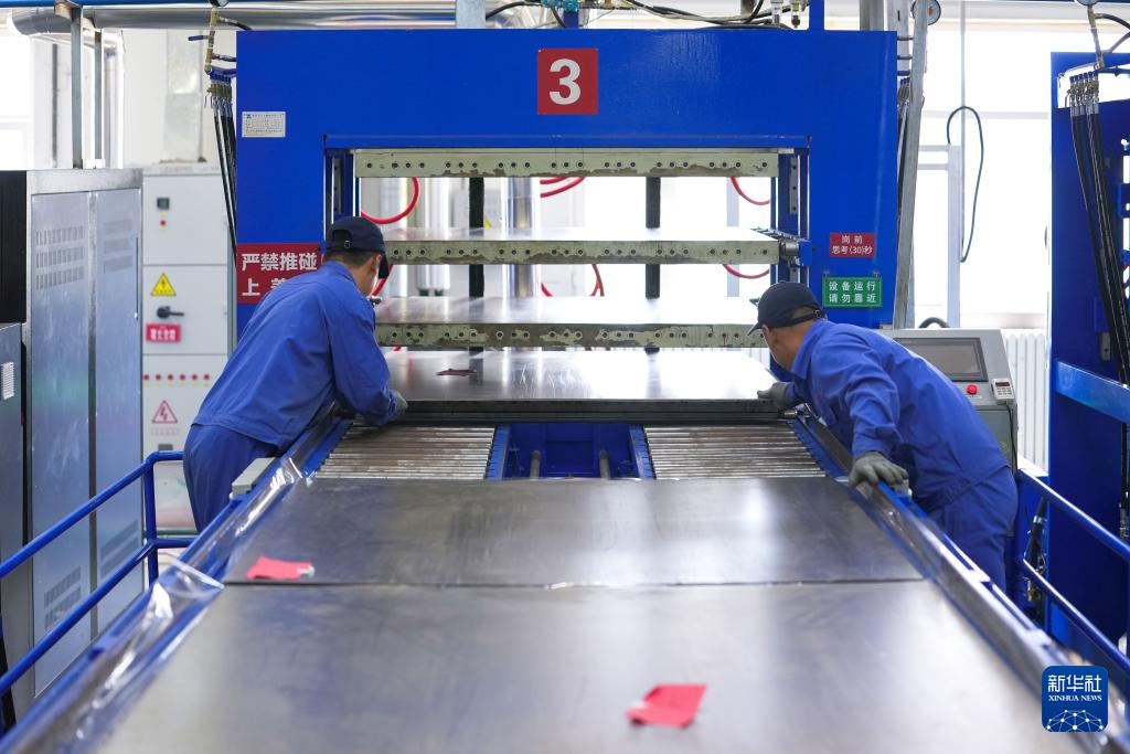 工作人员在吉林化纤集团国兴复材有限公司车间内加工碳纤维板材(9月17日摄)。