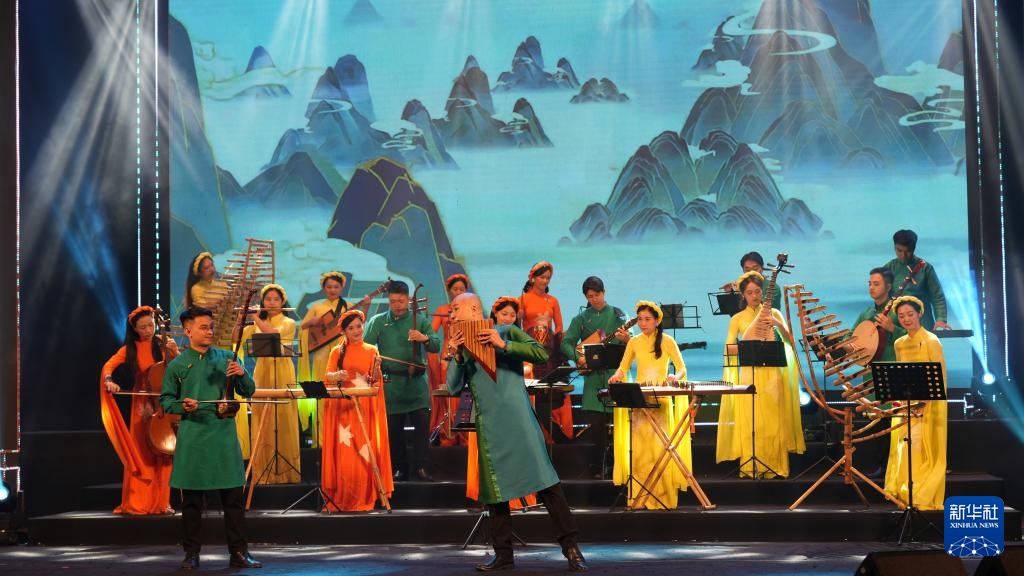 9月25日,在越南河内越南国家歌舞剧院,越南演员在2025年中越中秋文艺晚会上演奏越南经典名曲。