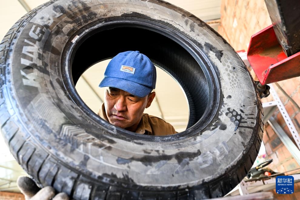 9月23日,钢宝力达在卫境嘎查家中的简易房内安装车胎。