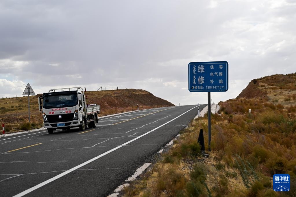 9月23日,钢宝力达驾驶救援车行驶在边境公路上,路边设置有标明他联系电话的指示牌。