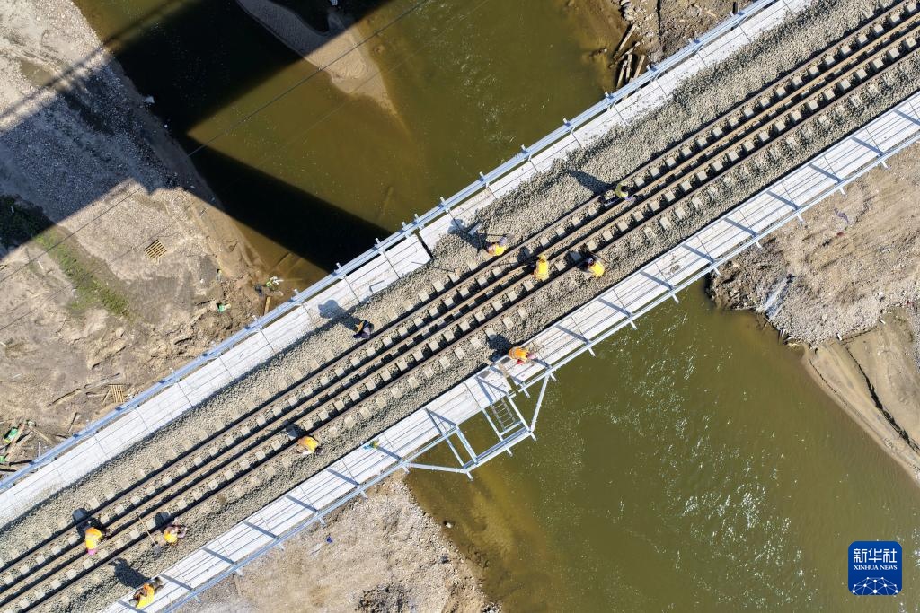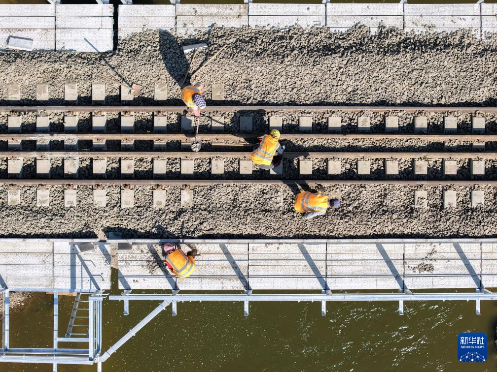 9月28日,工人在京通铁路河北隆化段施工(无人机照片)。