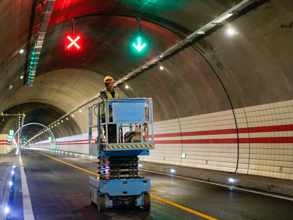 9月28日,中铁十一局的工人在夹金山隧道内进行收尾巡查施工。