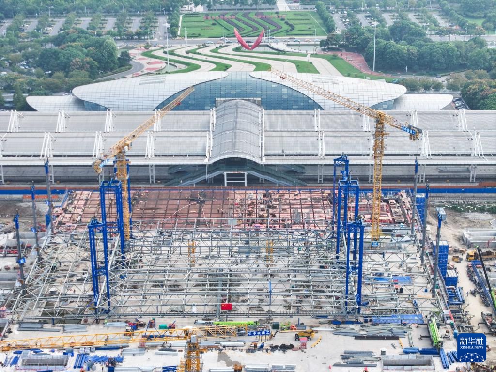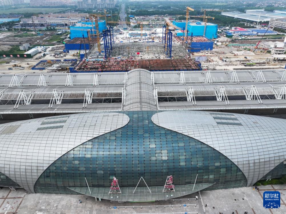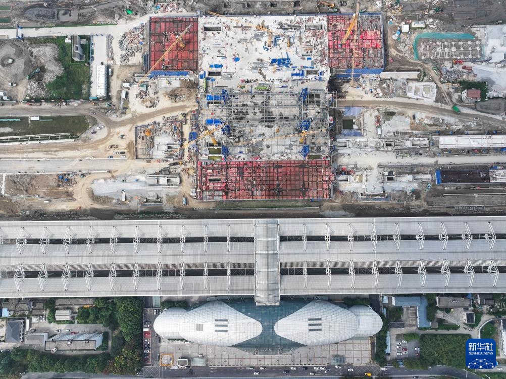 9月28日拍摄的新建南通站站房施工现场(无人机照片)。