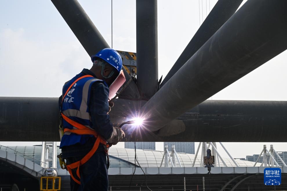 9月28日,中铁建工工人在施工现场进行焊接作业。