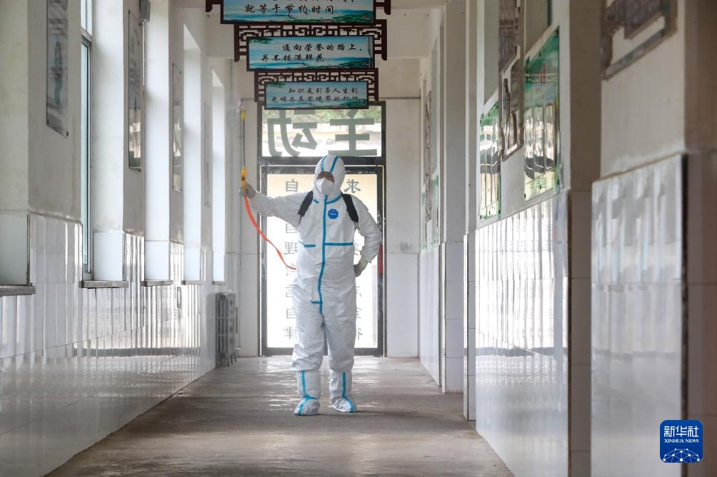 9月28日,在定西市漳县木林小学安置点,工作人员在进行环境消杀作业。