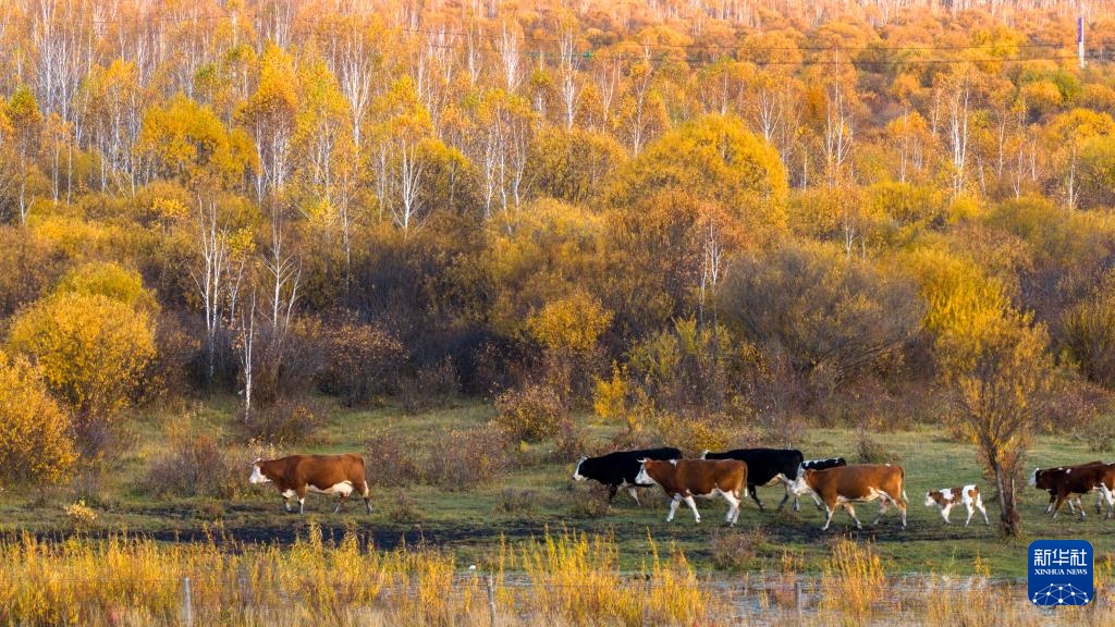 9月25日,在内蒙古呼伦贝尔市额尔古纳市恩和俄罗斯族民族乡,牛群在林间吃草(无人机照片)。