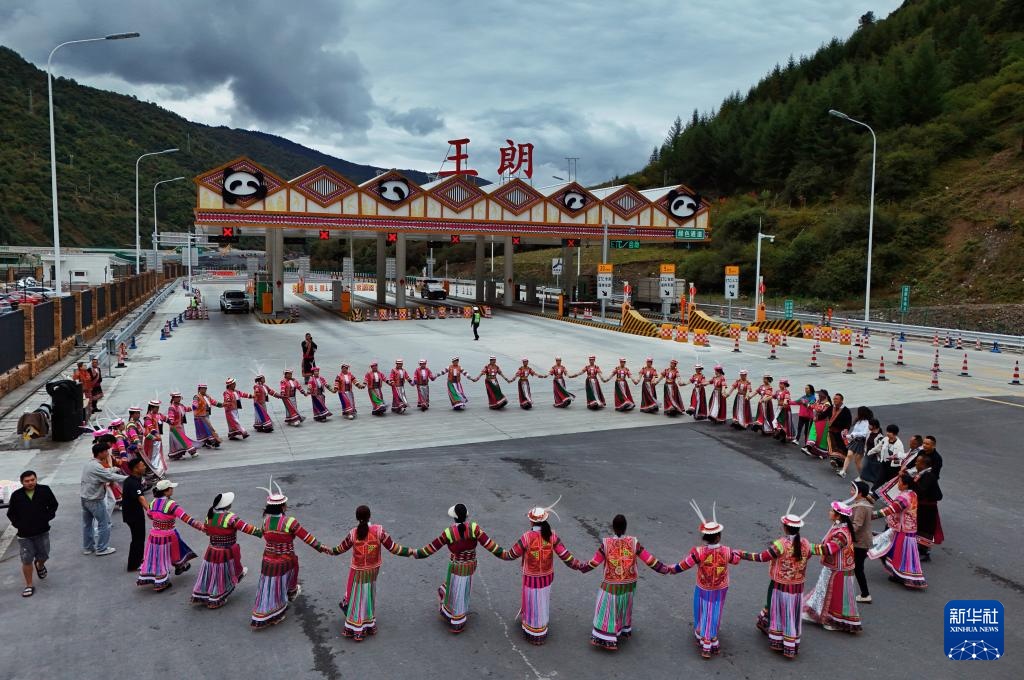 9月29日,在九绵高速王朗出口,平武县白马藏族乡群众载歌载舞,庆祝九绵高速全线通车(无人机照片)。