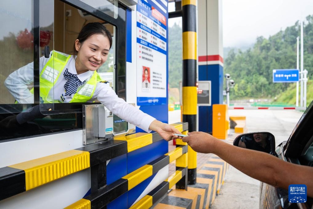 9月29日,在桑龙高速陈家河收费站,工作人员(左)在引导司机通行。
