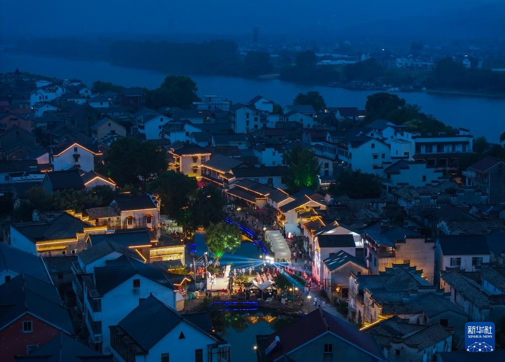 夜色中的杭州富阳区场口镇东梓关村(9月29日摄,无人机照片)。