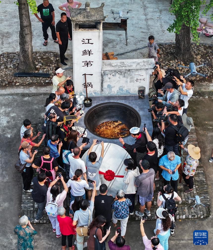 9月29日,富春江江鲜大会的主打项目“江鲜第一锅”开锅,吸引了众多游客前来品尝(无人机照片)。“江鲜第一锅”是在直径1.5米的大铁锅中炖煮上百斤的江鲜鲢鱼,香气四溢。