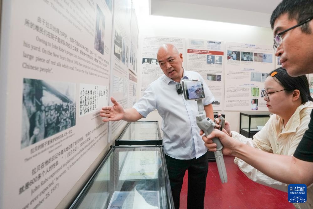 南京大学拉贝与国际安全区纪念馆主任杨善友(左)向观众介绍纪念馆的展览内容(9月22日摄)。
