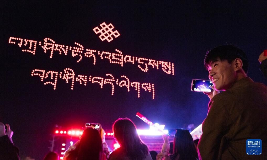 这是百威拉萨音乐嘉年华现场的无人机表演,藏语大意为“吉祥时刻,扎西德勒”(9月29日摄)。