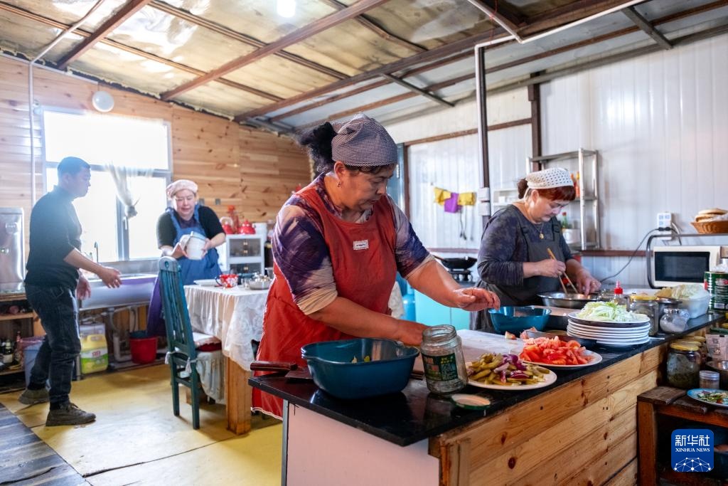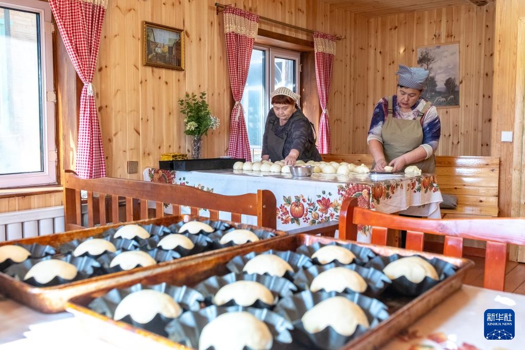 9月26日,在内蒙古呼伦贝尔市额尔古纳市恩和俄罗斯族民族乡,孙运梅(右一)与家人们在餐厅后厨为游客制作俄罗斯族特色美食。新华社记者 马金瑞 摄pagebreak