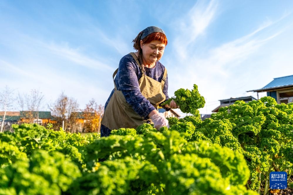 9月26日,在内蒙古呼伦贝尔市额尔古纳市恩和俄罗斯族民族乡,孙运梅在菜园里采摘制作沙拉用的羽衣甘蓝。新华社记者 马金瑞 摄pagebreak