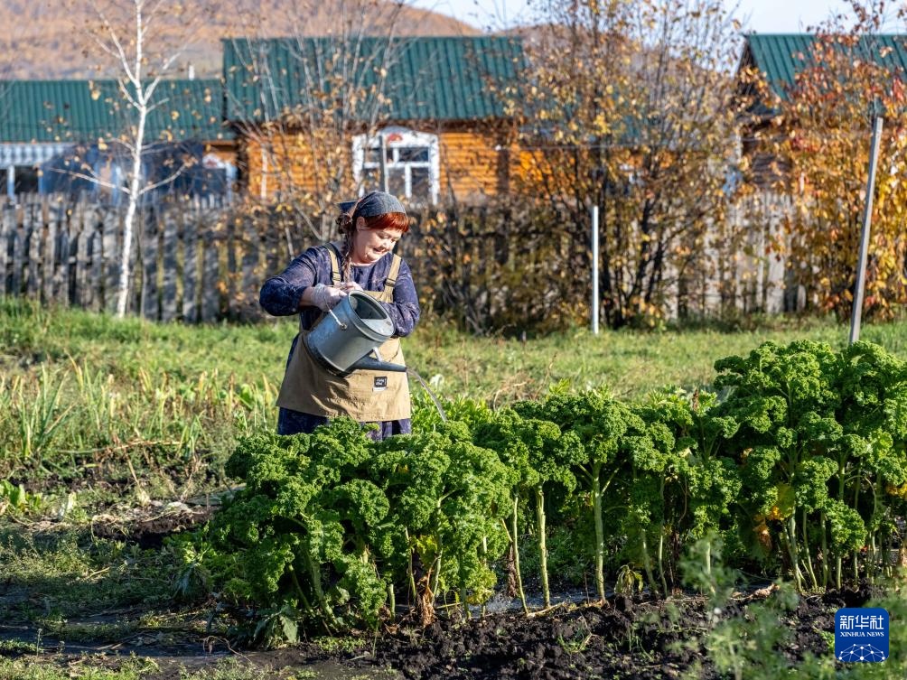 9月26日,在内蒙古呼伦贝尔市额尔古纳市恩和俄罗斯族民族乡,孙运梅给菜园浇水。新华社记者 马金瑞 摄pagebreak