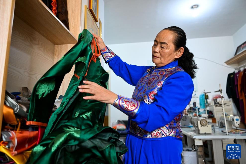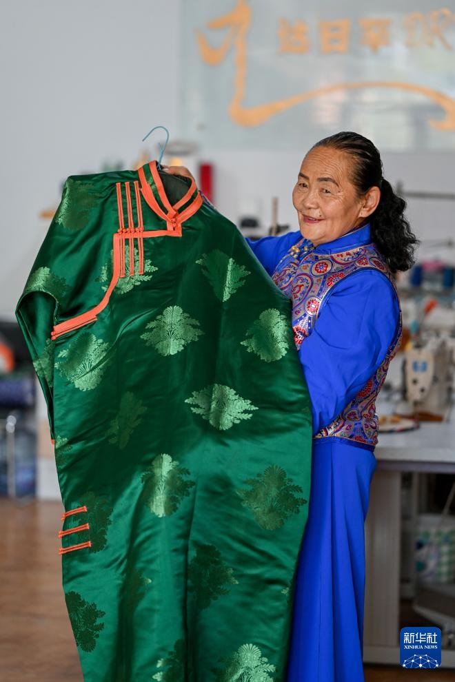 9月26日,通嘎拉嘎展示她制作的蒙古袍。