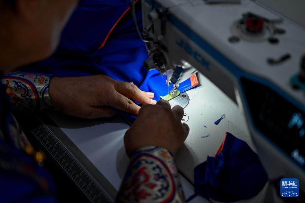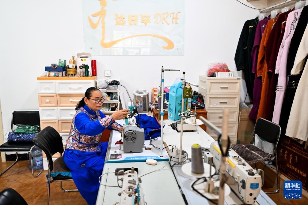 9月26日,通嘎拉嘎在店内缝制蒙古袍。