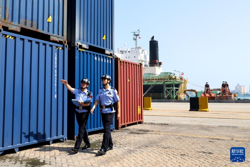10月1日,在山东港口日照港,日照出入境边防检查站民警对集装箱码头进行人工巡查。