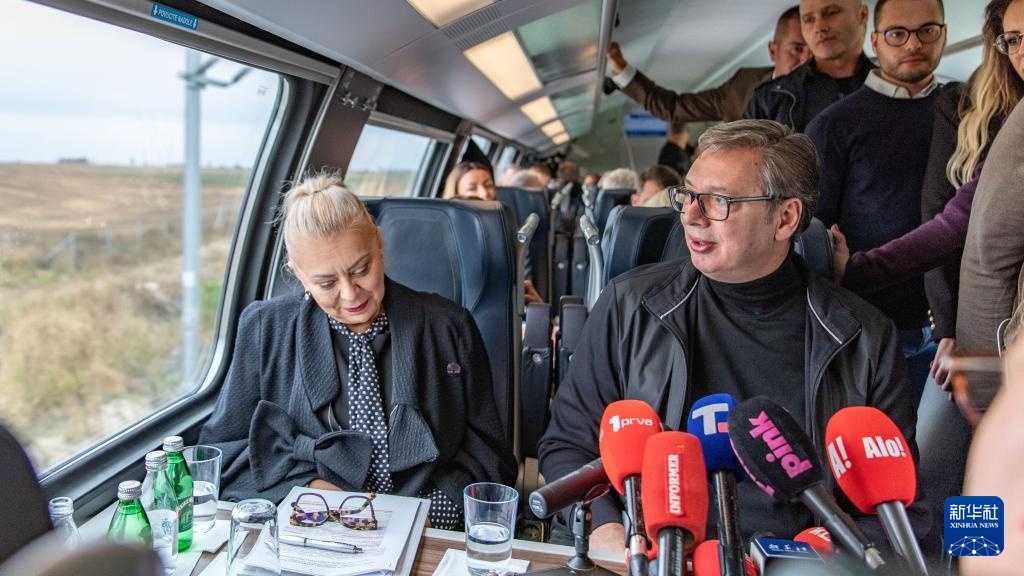10月3日,塞尔维亚总统武契奇(右)乘坐匈塞铁路列车从首都贝尔格莱德市前往苏博蒂察市。