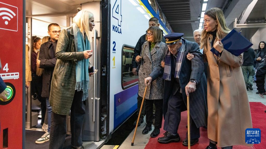 10月3日,在塞尔维亚首都贝尔格莱德,工作人员陪同塞尔维亚105岁的老人(右二)搭乘中企承建的匈塞铁路列车。