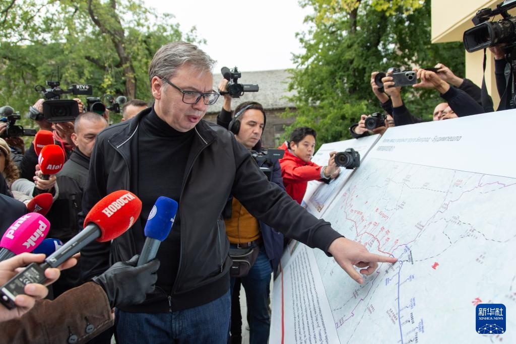 10月3日,在塞尔维亚北部城市苏博蒂察,塞尔维亚总统武契奇在通车仪式现场观看中企承建的匈塞铁路项目的路线展板。