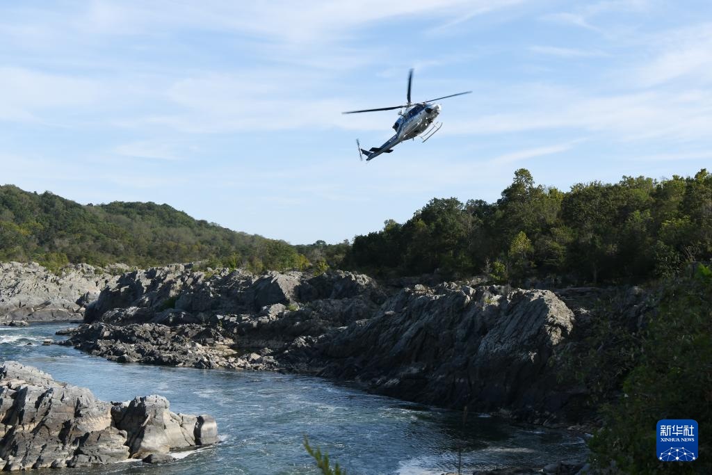 10月3日,在美国弗吉尼亚州费尔法克斯,公园警用直升机在大瀑布公园上空巡逻。受联邦政府“停摆”影响,大瀑布公园游客中心、公共厕所、停车场等服务设施处于关闭状态。